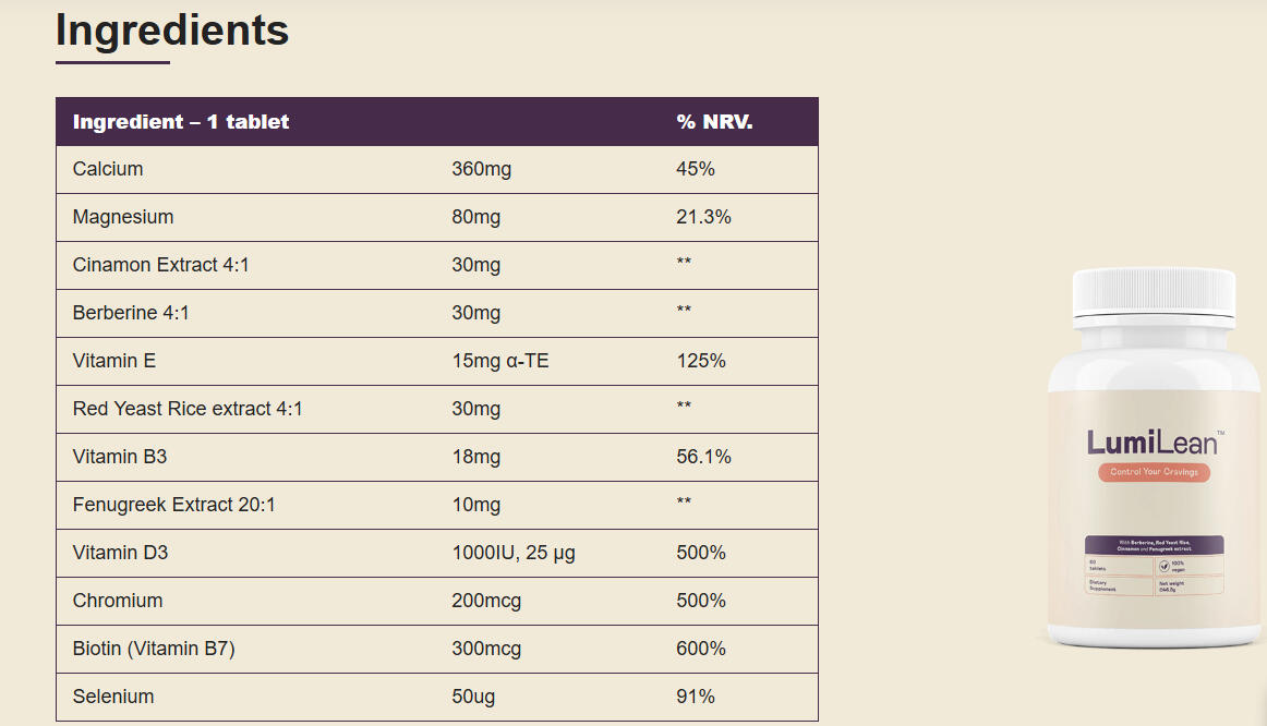 Faites fondre les dépôts de graisse – Sans régime ni entraînements épuisantsUne version plus en forme et plus saine de vous-même est à portée de main ! Les capsules LumiLean, fabriquées aux États-Unis selon les normes de qualité les plus élevées, offrent un mélange unique et innovant d'ingrédients naturels. Ces ingrédients travaillent en harmonie pour soutenir à la fois la perte de poids et le contrôle de l'appétit. Perdre du poids n'a jamais été aussi facile – obtenez des résultats rapides sans sacrifices ni entraînements chronophages !Beaucoup d'entre nous connaissent cette sensation lorsque le poids commence à échapper à tout contrôle. La clé est de prendre des mesures actives pour y remédier. Si vous cherchez un complément alimentaire pour vous soutenir dans votre parcours, les capsules LumiLean pourraient être le bon choix pour vous.Les capsules sont exclusivement fabriquées à partir d'ingrédients naturels, sans allergènes, et n'ont pas d'effets secondaires lorsqu'elles sont prises selon les instructions. Elles vous permettent de travailler à long terme vers vos objectifs sans compromettre votre santé.Tous les ingrédients sont considérés comme très tolérables et ne devraient pas causer de problèmes. Cependant, il est important de respecter strictement la posologie recommandée par le fabricant. Prendre plus que la quantité recommandée n'améliorera pas les effets et pourrait augmenter le risque d'effets secondaires.Avant d'utiliser les capsules, assurez-vous de ne pas être allergique à l'un des ingrédients. Si c'est le cas, il vaut mieux éviter de les prendre. Si vous n'êtes pas sûr, il est recommandé de consulter un médecin. Il pourra vous fournir des informations supplémentaires et vous guider sur l'utilisation sûre des capsules.